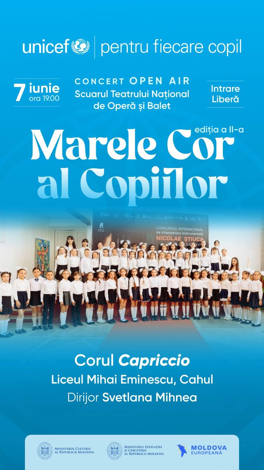 Corul de copii CAPRICCIO al Liceului Teoretic „Mihai Eminescu” din municipiul Cahul, coordonat de dirijorul Mihnea Svetlana, a participat cu emoție și dăruire la evenimentul cultural-artistic Marele Cor al Copiilor.